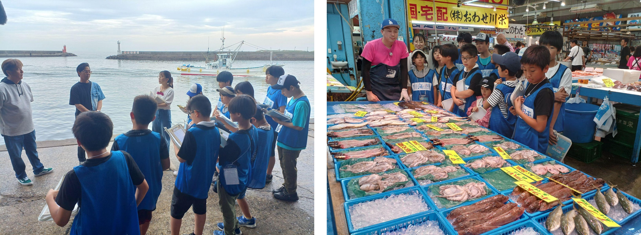 子どもたちは豊浜漁港へ行き、現役の漁師さんたちに話を聞きました。「愛知で一番、たくさんとれる魚は何ですか?」「季節によってとれる魚は違うんですか?」「昔と今でとれる魚は変わっていますか?」など、次々と質問が飛び出します。碧南水族館で学んだ魚の中に、トゲに毒があるので処理が難しく未利用魚になっている「アイゴ」という魚がいました。アイゴが増えて海藻を食べ尽くすと“磯焼け”(海底の藻が少なくなって砂漠化する現象)が起きることを知りました。豊浜漁港でも「アイゴ」は人気がなく、流通することは少ないそうです。漁師さんたちの願いは「地元の魚をもっと食べてほしい」ということ。アイゴも、トゲの毒に気を付けて内臓をとるなどきちんと下処理をすれば、美味しく食べられるそうです。