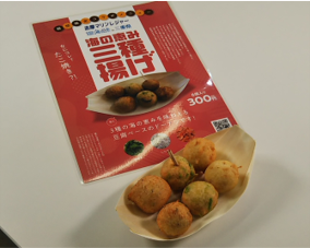 <海の恵み三種揚げ> メニュー:豆腐ベースのドーナツ あおさ、しらす、さくらえびの3種類 販売場所:イルカ島 島内食堂 発売日:イベント期間中の2023年8月10日(木)~9月24日(日) 値段:6個入り 300円(税込) |