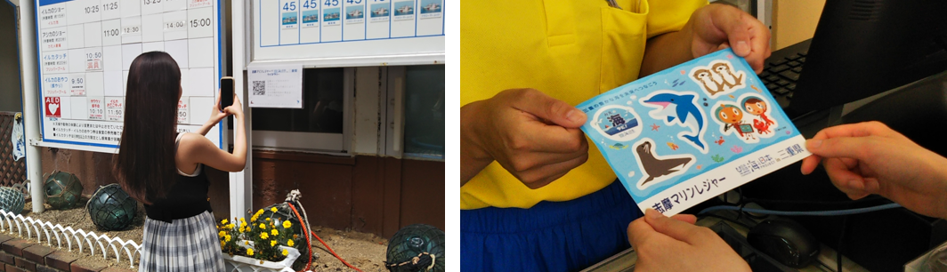 「イルカ島クイズラリー」は、スマートフォンで読み取ったクイズに、島内に配置されたヒントを頼りに答えていくというもので、回答結果を係員に見せることで、オリジナルシールを手に入れることができます。