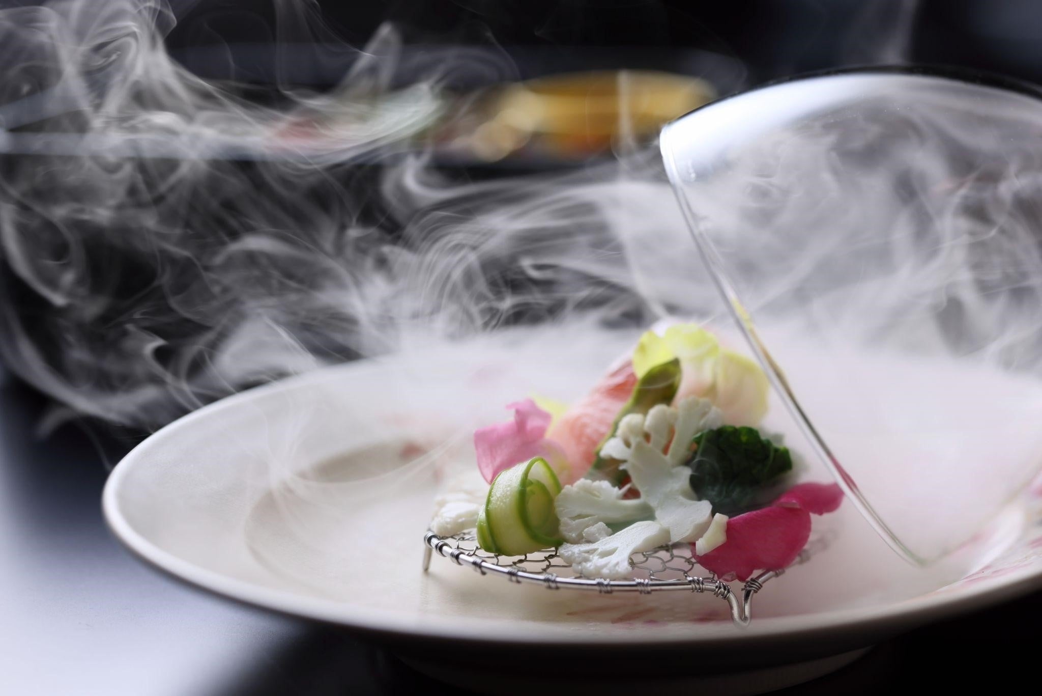【造り】琵琶鱒昆布〆と春野菜の瞬間スモーク
