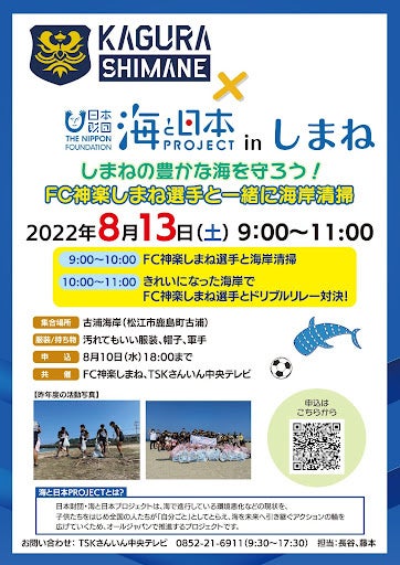 海と日本プロジェクトinしまね実行委員会は、JFL所属のサッカーチームFC神楽しまねとのコラボレーションで、8月13日(土)に松江市の古浦海水浴場で、海岸清掃とビーチサッカーをかけ合わせたイベントを開催します。