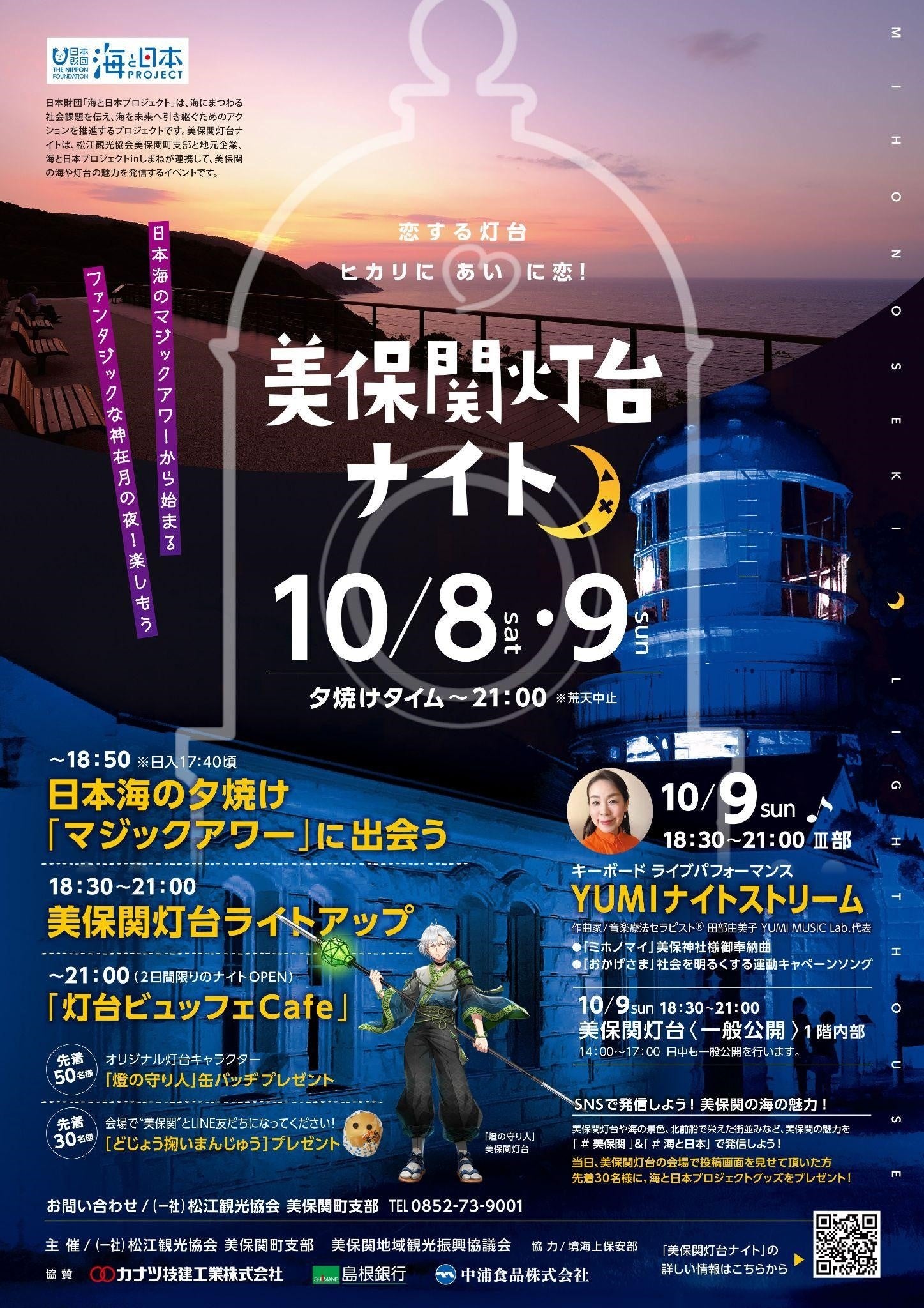 海と日本プロジェクトinしまね実行委員会は、10月8日(土)・9日(日)の両日に、松江観光協会美保関町支部や地元企業と連携し、松江市美保関町の海や灯台の魅力を発信するイベント「美保関灯台ナイト」を開催いたします。
