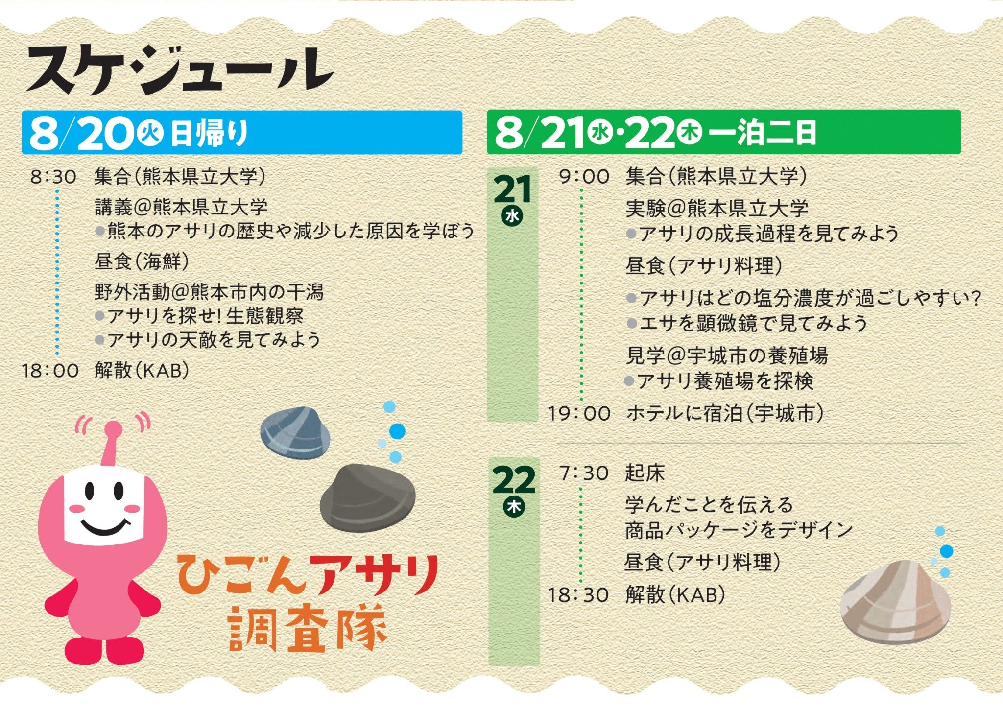 一般社団法人くまもと海のミライは、「ひごんアサリ調査隊~熊本のアサリを守ろう~」を8月20日(火)~22日(木)に開催。熊本のアサリの現状を学び、アサリの復活のためにどのような活動や研究をしているのか等を専門家から学ぶイベントです。