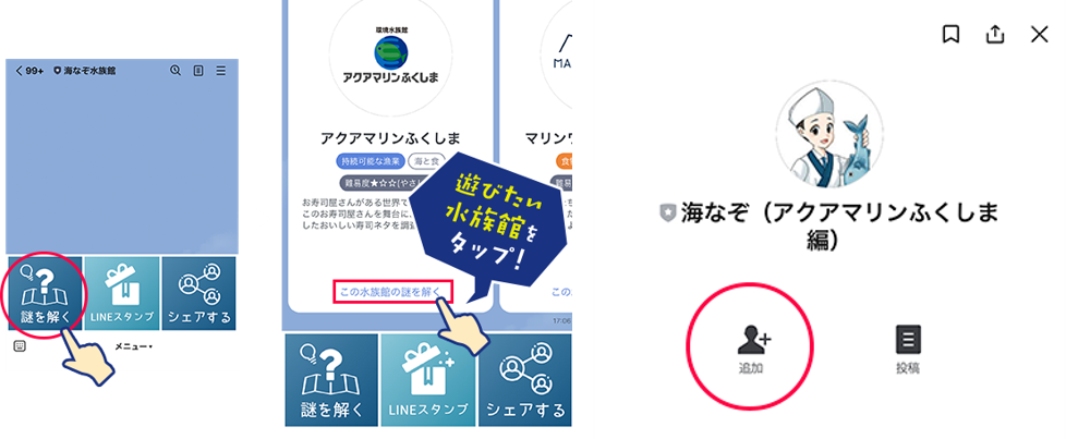 ▼「海なぞ水族館」のLINE公式アカウントから遊びたい水族館を選ぶと、専用のゲームアカウントで謎解きをプレイすることができます。