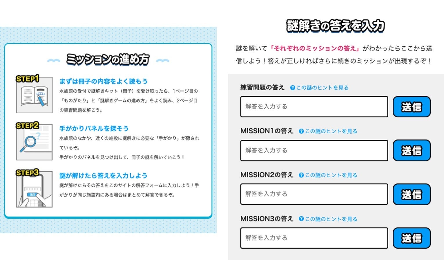 そこで当協会では、近年大ブームを引き起こし、市場規模500億円以上ともいわれている「謎解き」を活用し、海のSDGsについて楽しく遊んで学べる謎解きリアルイベント「貝社員とアッサリ挑戦!海の謎解き大作戦」を開催。本イベントは蒲郡市竹島水族館(愛知県)/上越市立水族博物館 うみがたり(新潟県)/サンシャイン水族館(東京都)が一般社団法人謎解きエデュテイメント協会と連携し、昨今の情勢下で学びの機会が減少しつつある子どもたちに海洋問題への理解・関心を深めてもらうべく企画されました。