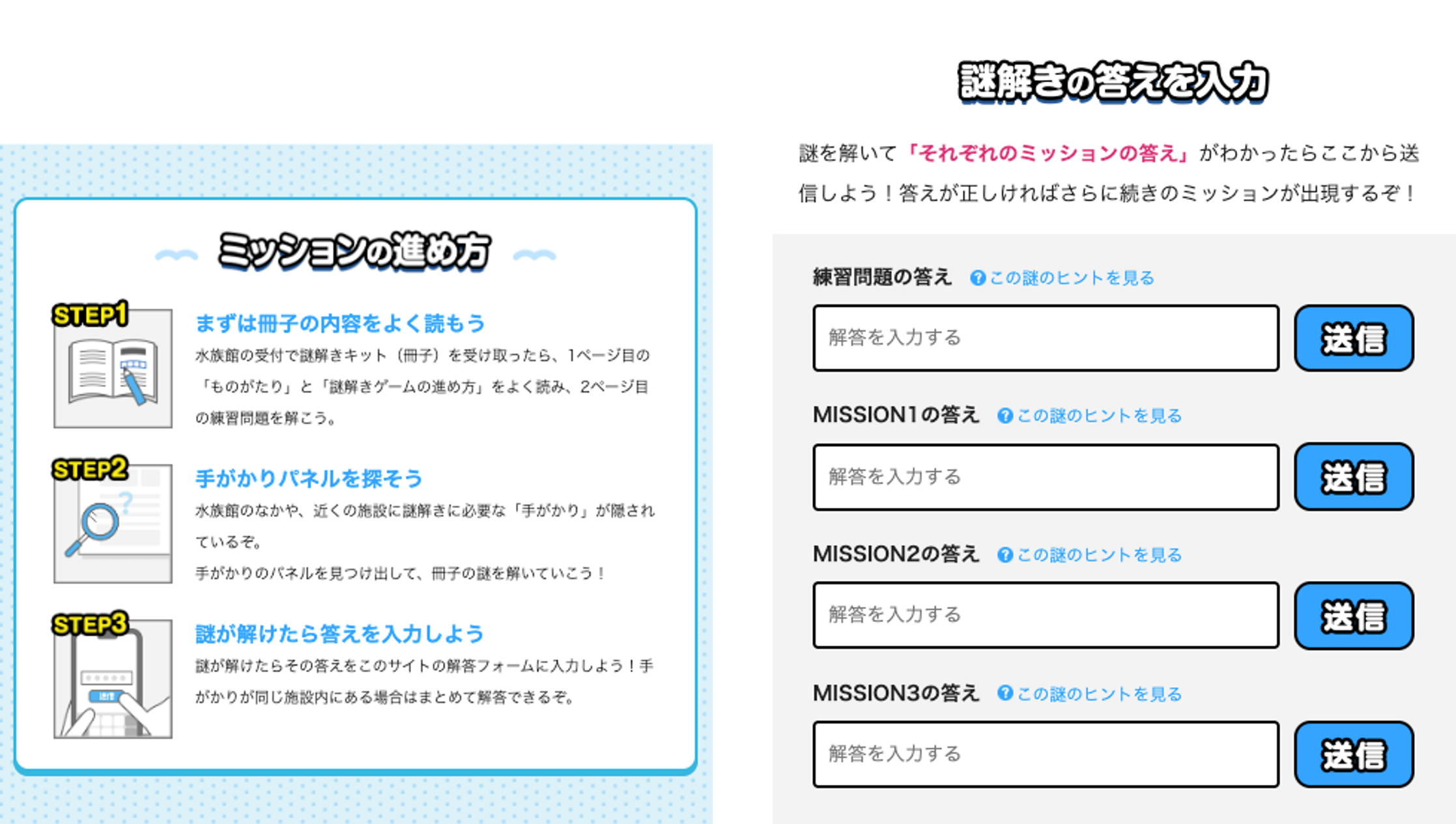 ②謎が解けたらサイト上に答えを入力!全ての謎にヒントが設定されているので、謎解きに自信がない方でも安心してお楽しみいただけます。