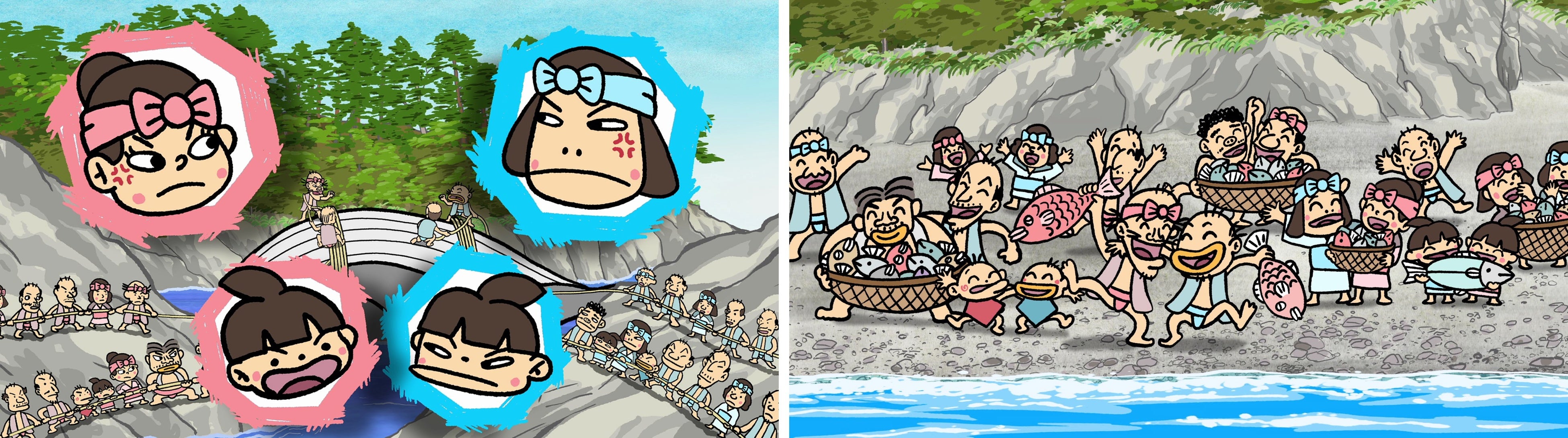 南三陸町 佐藤町長を中心とした実行委員会を設立し、伝承の内容をどのようにアニメに落とし込むかを話し合い、シナリオを決定。その後、アニメ監督による現地でのロケハンをもとに、神様が割ったという岬の岩や、岩の裂け目から昇る日の出をアニメ内で神々しく表現しました。