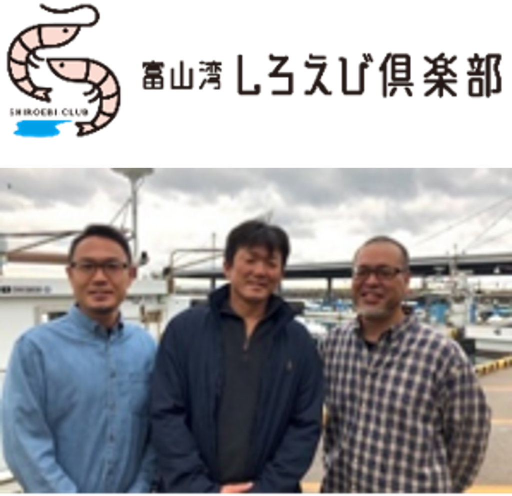 体験見学協力の「富山湾しろえび倶楽部」。富山県射水市の新湊漁協所属のシロエビ漁師3人で同倶楽部を結成し、シロエビの漁獲保全や県外での知名度アップ、さらなるブランド化を目指し活動中。