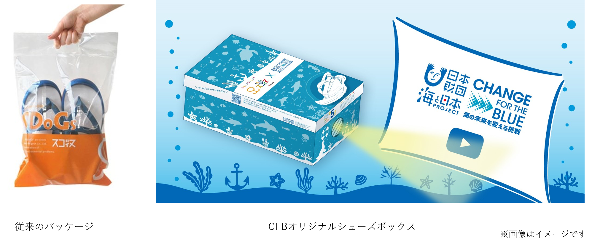 この度CFB大阪は、大阪の靴メーカー「リゲッタ」がペットボトルを再利用した素材で作った靴ブランド「スゴィヌ」とコラボし、再利用できるシューズボックスを制作いたしました。