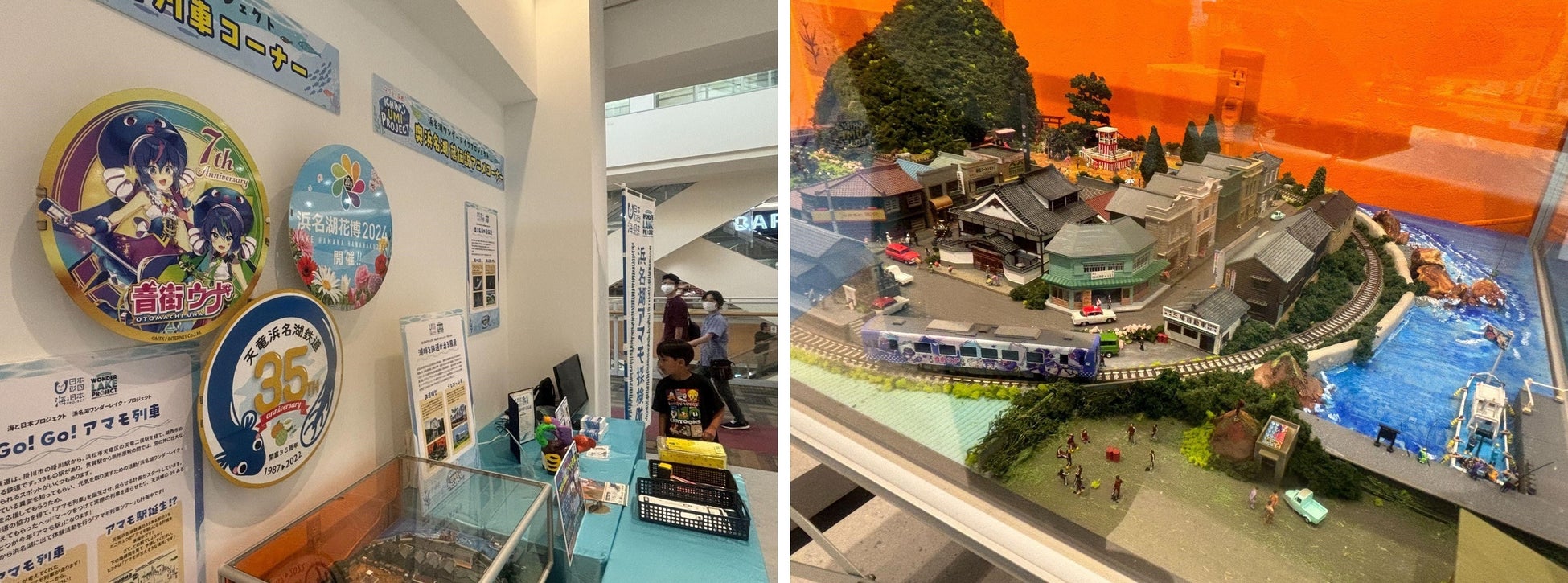 そのほか、会場では浜名湖ワンダーレイク・プロジェクト有識者委員会のメンバーが独自に開発した、浜名湖海底調査用の「水中ドローン」や、浜名湖調査に使用している「スキューバダイビング器材」を特別展示しています。また今年度、浜名湖ワンダーレイク・プロジェクトが天竜浜名湖鉄道とのコラボで走らせることが決まっている「アマモ列車」について、湖畔に沿って走る天竜浜名湖鉄道を表現した「鉄道模型ジオラマ」や、天浜線が過去につけて走った「ヘッドマーク」などが展示され、「アマモ列車」のヘッドマークデザインを皆さまから募集するコーナーも設置されています。さらに、昨年度の海ノ民話のまちプロジェクトで制作された「海ノ民話・奥浜名湖の鵺伝説」アニメを会場内で上映し、このアニメとコラボで開発された「鵺まんじゅう」なども展示されていて、ファミリーで楽しめる内容となっています。