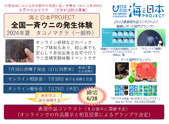 お茶の水女子大学湾岸生物教育研究所は、2024年7月17日(水)~8月31日(土)に、全国各地の学校への教材提供と、ご家庭で本格的な発生実験...