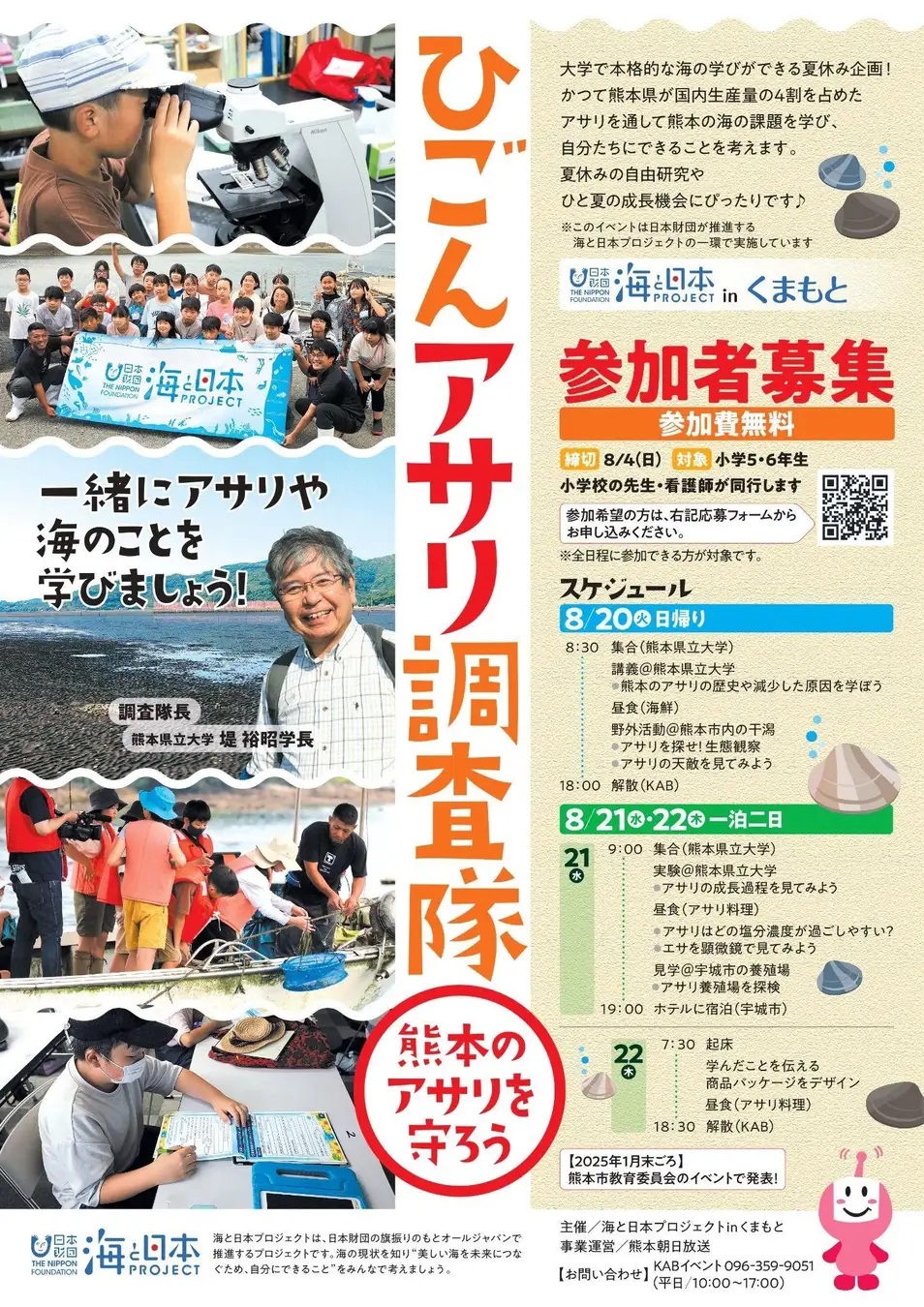 一般社団法人くまもと海のミライは、「ひごんアサリ調査隊~熊本のアサリを守ろう~」を8月20日(火)~22日(木)に開催いたします。このイベン...