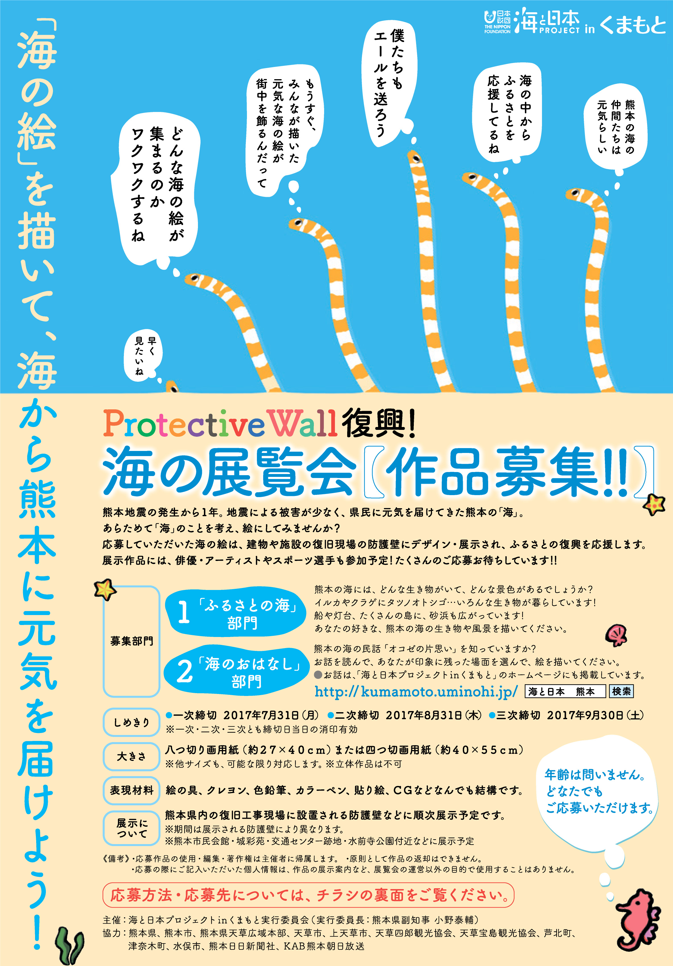 この度「海と日本プロジェクトinくまもと」では、海の絵を募集し、県内各地に展示するイベント、「ProtectiveWall復興!海の展覧会」...