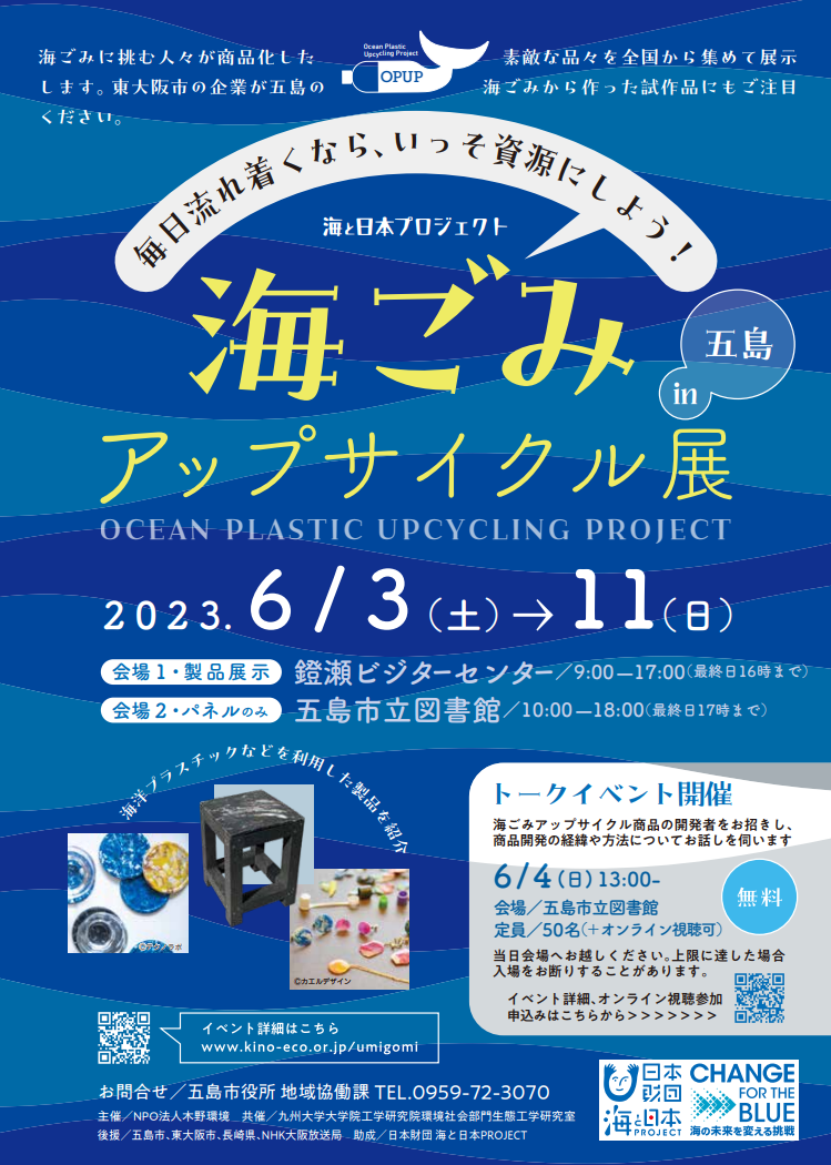 NPO法人木野環境は、6月3日~11日に<海ごみアップサイクル展 in 五島>を開催いたします。このイベントは、日本財団が推進する海洋ごみ対...