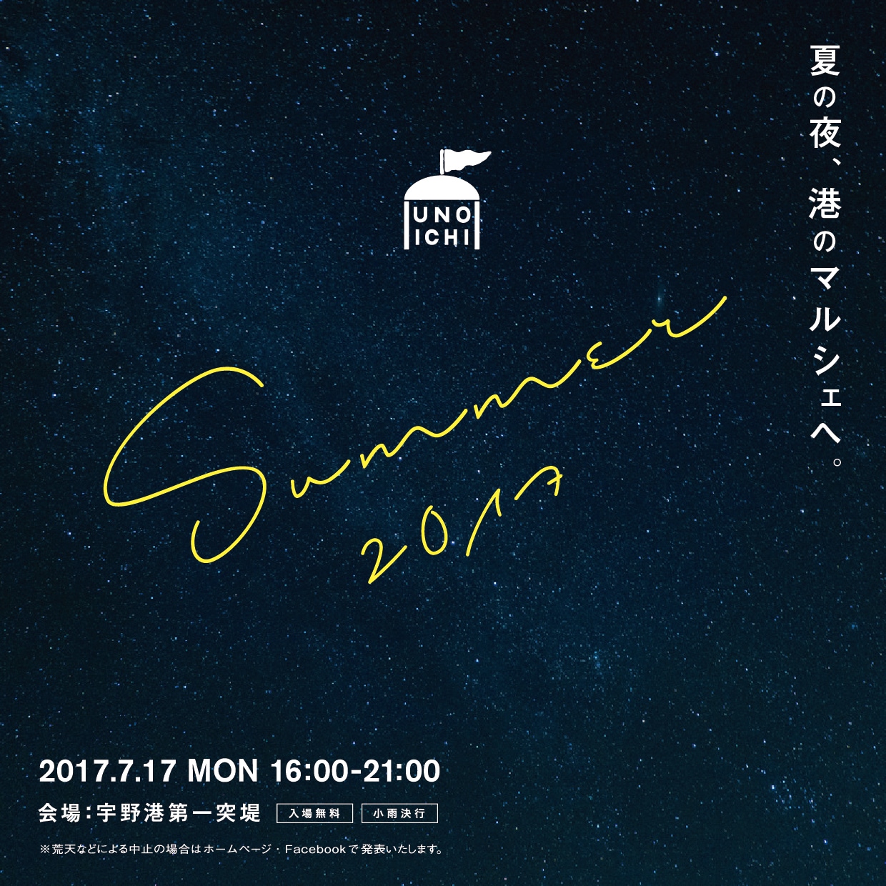 『夏の夜のUNOICHI ~夜の海を楽しむマルシェ~』 「夏の宵に誘われて・・・。海と港であなただけの時間。」 ◆来場目標数:300...