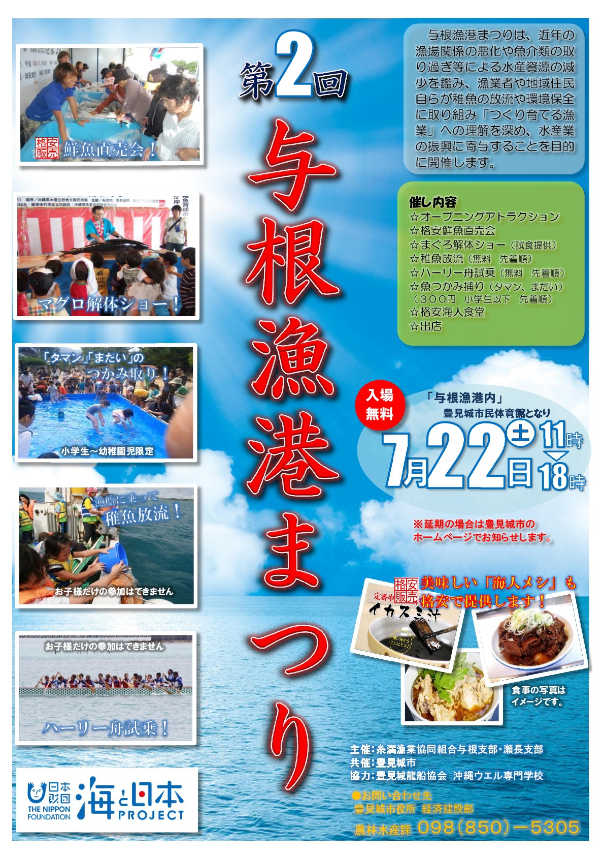 与根漁港まつりは、近年の漁場関係の悪化や魚介類の取り過ぎ等による水産資源の減少を鑑み、漁業者や地域住民自らが稚魚の放流や環境保全に取り組み「...