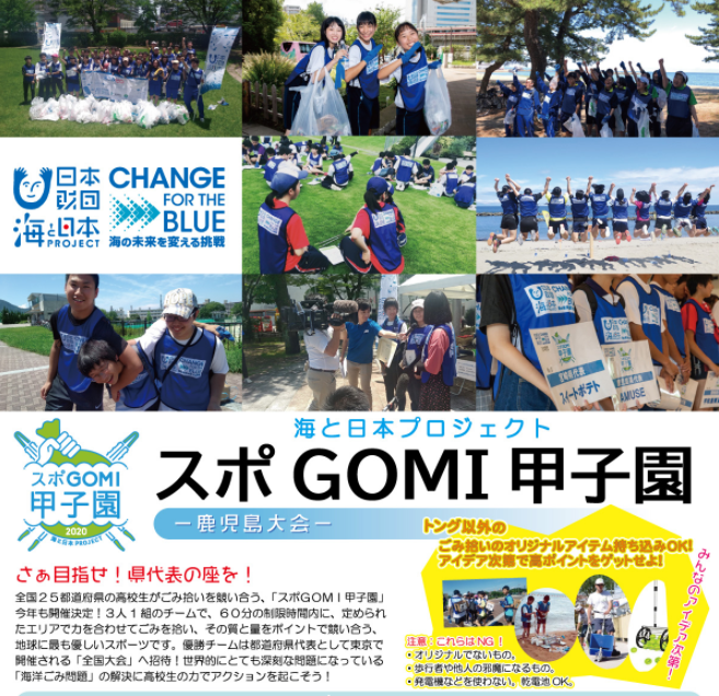 海と日本プロジェクトスポGOMI甲子園実行委員会及び日本財団は、10月24日(土)にスポGOMI甲子園鹿児島県大会を開催します。海洋ごみ問題への気付きをテーマに25都道府県の高校生を対象としたごみ拾いイベントの、今回はその鹿児島県大会です。見事、鹿児島県代表になったチームは11月に東京で開催される全国大会に招待されます。このイベントは、次世代へ海を引き継ぐために、海を介して人と人とがつながる“日本財団「海と日本プロジェクト」”の一環です。