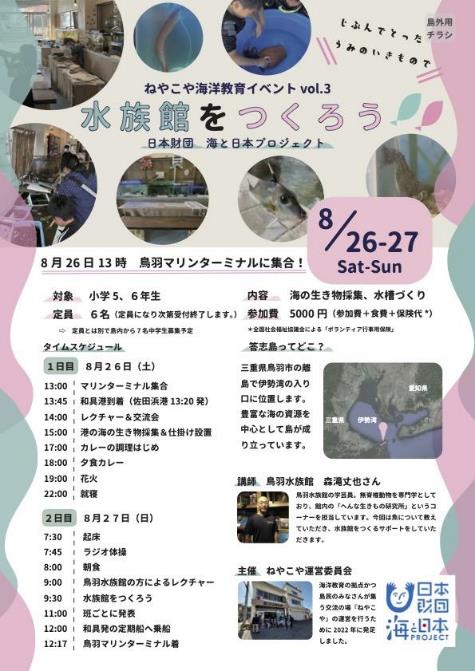 ねやこや運営委員会は、2023年8月26日(土)〜27日(日)にねやこや海洋教育イベントvol.3「水族館をつくろう」を開催いたします。