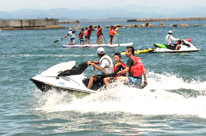 小学校高学年の子どもたちを中心に、SUP(スタンドアップパドルサーフィン)や水上バイク、シーカヤックなどの体験を通じて、海の安全や「そなえ」の必要性について学んでもらうイベントです。