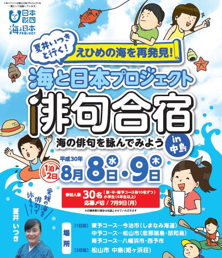 海と日本プロジェクトえひめ事務局は、愛媛県の東予、中予、南予の3コースに分かれて島の生活や海のお仕事体験、マリンスポーツなど各地域で体験したことを俳句で詠みながら、愛媛県を大満喫できる今年一押しの夏休みイベント、2018年8月8日(水)・9日(木)<一泊二日>で「えひめの海を再発見!夏井いつきと行く!俳句合宿in中島」を開催いたします。このイベントは、次世代へ海を引き継ぐために、海を介して人と人とがつながる“日本財団「海と日本プロジェクト」”の一環です。