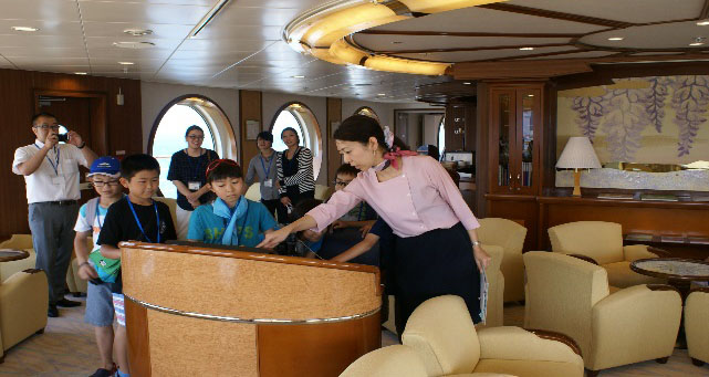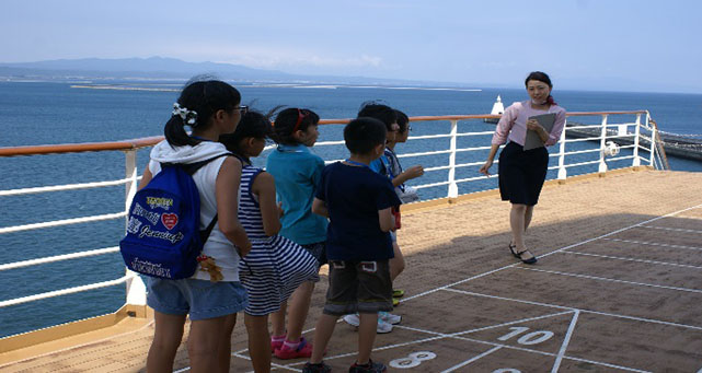 クルーズ客船乗員による客船・船旅にまつわる話や、客船の特徴、構造、更には船内業務等についての講演を聞き、子どもたちにクルーズ客船やそれに携わる人達について知ってもらう。その後、客船船内各所を見学しながら解説を受け、客船船内で課外授業を実施し感想文を書く。