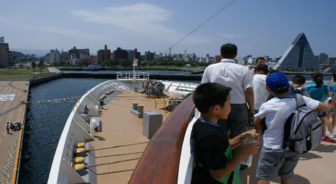 8月5日、にっぽん丸が青森港へ寄稿しました。10:00よりクルーの案内のもと、小学生8名にっぽん丸に乗り込み、クルーズ客船の船内見学会を実施しました。