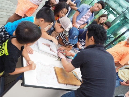 8月27日(土)、28日(日)は、並んでいる魚をさばき、魚の体のつくりを紹介しました。魚の体のつくりや機能については特に子どもが興味をもち、タッチコーナーからさばいて欲しい魚を持ってくる子どももいました。