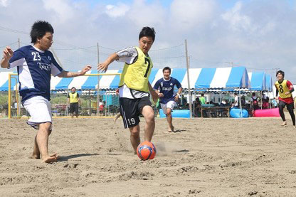 平井海水浴場ビーチサッカー場ではビーチサッカークリニックが開催され、多くのサッカー少年が慣れない砂浜でのサッカーに苦戦しながらも、大いに楽しんでいました。