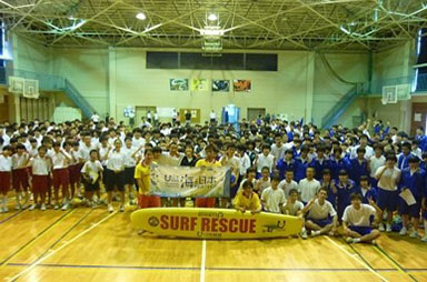 海水浴シーズンを前に、NPO法人鹿嶋ライフガードチームによる「海の安全教室」が、市立大野中学校体育館で全校生徒を対象に実施されました。