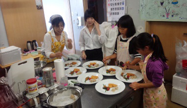 5品を子ども達がメインとなり、調理をしました。先生から料理のコツなどを聞きながら、盛り付けもおいしく見せるように工夫しました。