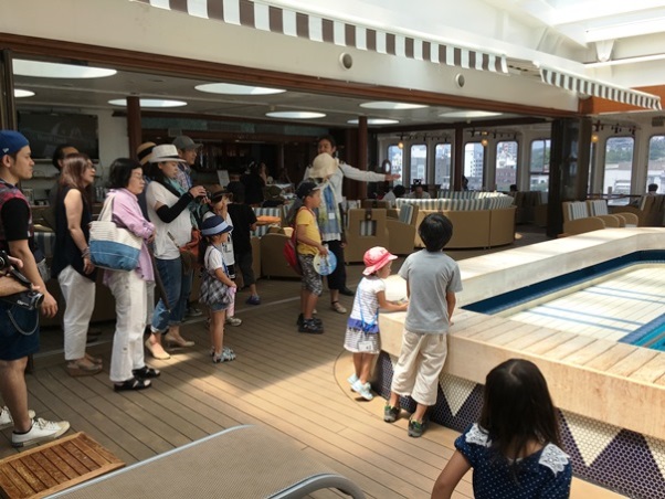 参加者は、客船「にっぽん丸」の船内を見学し、豪華客船の設備などの説明をクルーから受けました。その豪華さに参加者からは驚きの声があがりました。