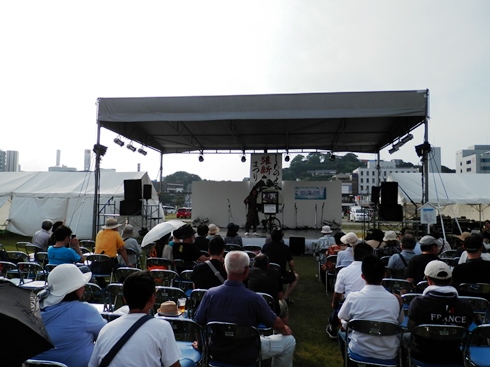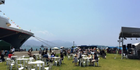 関門海峡の絶景と豪華客船を眼前に望み、また雲が無い晴天の青色と鮮やかな芝生の緑色のコンストラストが美しい当フェスタ会場で、本格的なオープンカフェを実施しました。