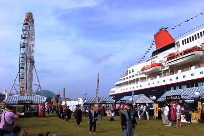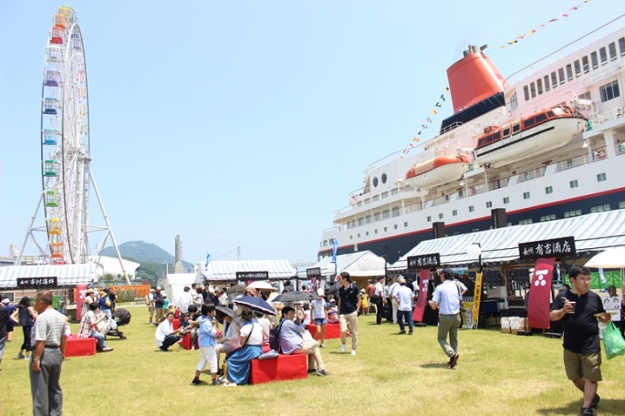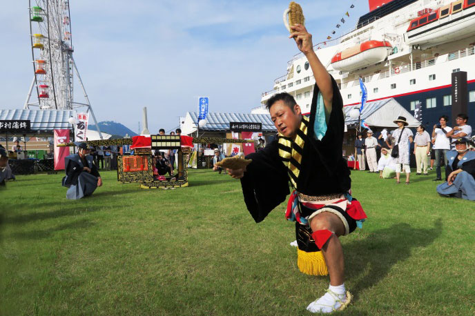 7月18日の「海の日」に、商船三井客船株式会社の客船「にっぽん丸」が、当フェスタイベント会場の眼前に寄港。陸側の参加者には豪華客船の寄港を間近で見てもらい、また客船の乗船客に対し市民でお出迎え・おもてなしすることで、海峡都市・下関の魅力を体感してもらいました。