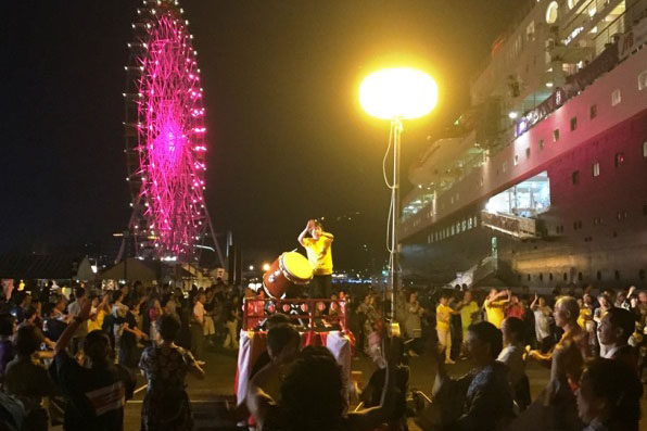 客船からは乗船客だけでなく、クルーの大半も参加し、太鼓や三味線の音が響く中、総勢400名の客船乗客と地元住民が輪になって踊りました。客船と地元住民が相互参加でつくりあげる画期的なイベントとなりました。