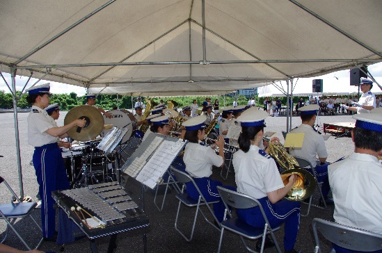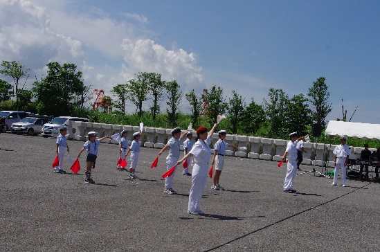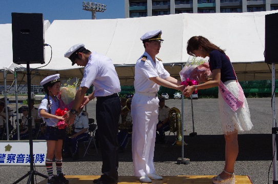 招待者26名、千葉県警察音楽隊35名、海洋少年団12名、大成丸乗員157名など、総勢300名が参加。大成丸着岸時には海上保安部巡視艇の歓迎放水、海洋少年団による手旗実演がありました。歓迎セレモニーではポートクイーン千葉の司会のもと、主催者・港湾関係者の挨拶、大成丸への記念品と花束贈呈、千葉県警察音楽隊の演奏などが行われました。