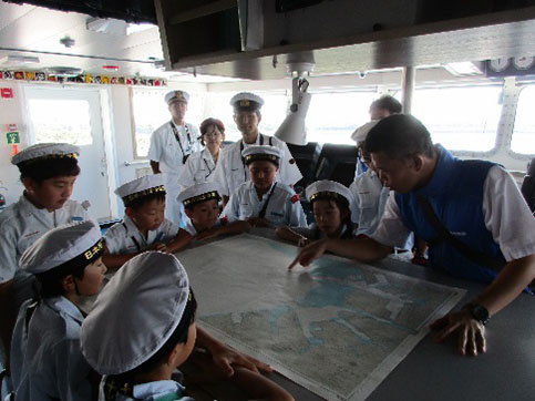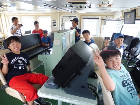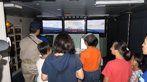 実習船橋には操船シミュレータがあり、子どもたちは職員の指導を受けながら船の運航について学び、実際にシミュレータを操作しました。職員の方の説明がとても分かりやすく、子どもたちは楽しみながら船員の仕事について学ぶことが出来ました。質疑応答では乗船中は3食付きというお話を聞いた子どもたちから「好きな食事のメニューは?」などの質問がとびだし、始終笑顔が見られる海洋教室となりました。