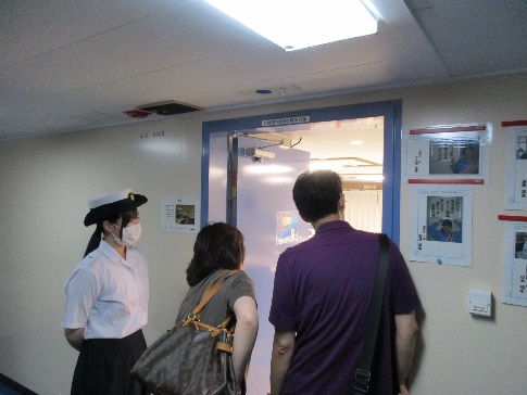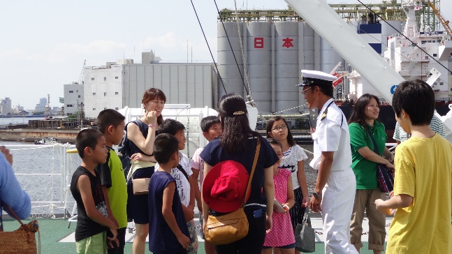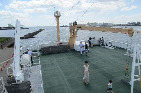 夏空の気温の高い中、船内には実習生が案内役にたち、見学者からの質問に笑顔で答えていました。親子連れはもちろんですが、年配の見学者も多数ご来場いただきました。中には昔に練習船に乗っていたという方もおり、昔を思い出しながら最新鋭の設備・船内を見学していました。