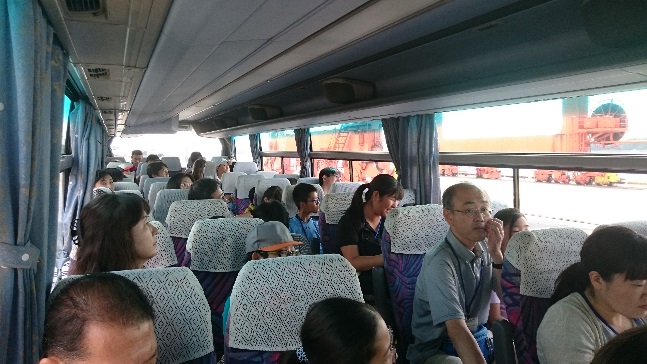 42名の参加者は千葉ポートタワーに集合。コンテナターミナルへ向かうバスの車中では、港の機能・役割、千葉港の貿易の概要についてバスガイド役のポートクイーン千葉からお話があり、海に囲まれた日本にとって港がいかに重要な役割を担っているかを学びました。