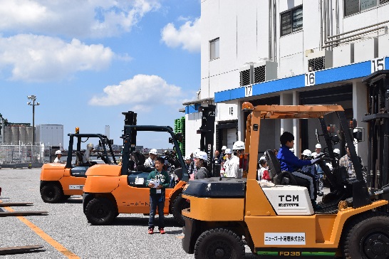 コンテナターミナルではガントリークレーンやストラドルキャリヤーの荷役方法の説明があり、荷役機械をバスの中から見学しました。冷凍倉庫見学ではニューポート産業(株)様のご協力のもと、物流システムのお話を聞いてから実際に冷凍倉庫の見学をしました。冷凍倉庫の中では生花を凍らせたものが用意され、どのような状態になるのか観察しました。また、バナナで釘が打てるのかなど、小学生の見学会らしい実験内容に子どもたちは興味津々で、実験に参加していました。倉庫の外にはフォークリフトが並べられ、触れたり、乗車して写真を撮るなど、物流の仕事に触れる事ができました。