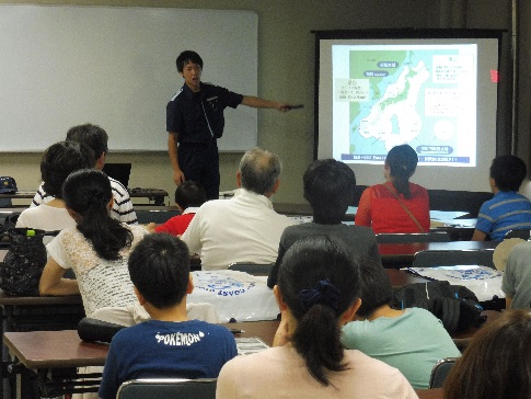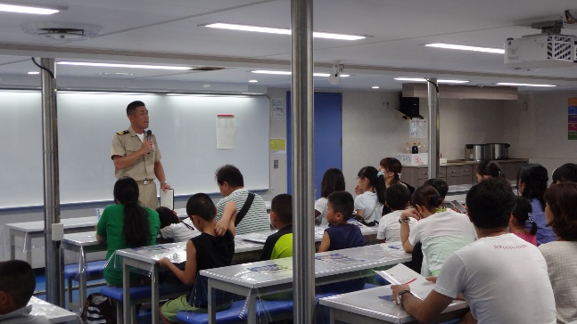 勉強会では千葉海上保安部の若手の海上保安官が講師となり、日本を取り巻く海のことや千葉海上保安部の業務について、クイズを交えて楽しく勉強しました。最後には子どもたちからの素朴な質問に、説明役の海上保安官が慌ててしまう場面もありました。