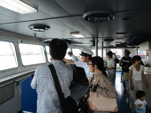 航行中の「あるめりあ」の船内では、ガイド役のポートクイーン千葉が千葉港の説明をしました。話し方や間の取り方などもとても聞きやすく、見学者は熱心に耳を傾けていました。また、観光船の脇をかもめが併走してついてきており、子どもたちは手を伸ばしてかもめにえさをあげるなどして、夏休みの1日を楽しんでいる様子でした。