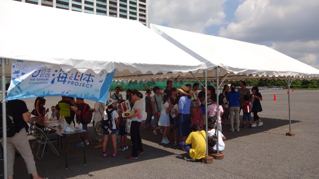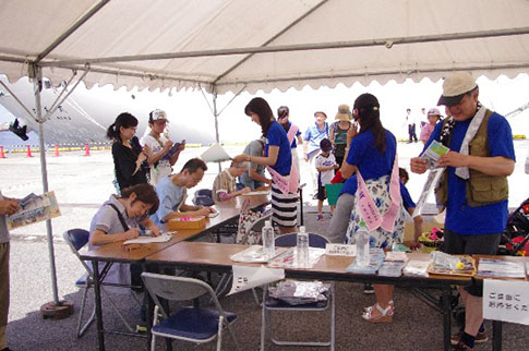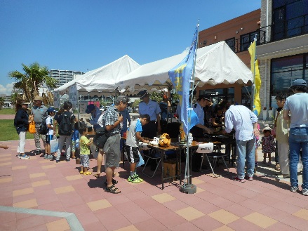 清掃兼油回収船「べいくりん」の模型展示や活動紹介として、過去に回収されたゴミの例や、昨年の台風による大雨後に回収した流木や回収実績などをパネルで説明しました。ブースを訪れた親子連れは、双胴船であるべいくりんの形に興味を持ち、ゴミの回収方法などについて質問していました。
