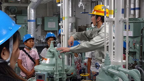 説明の後は参加者45名は3グループに分かれ、グループごとに見学を行いました。航海船橋では海図の説明を受け、海洋教室でしか見学できない機関室では主発電機を子どもたちの手で起動・停止させてもらったり、航行中の船の部品を修理する工作室を見学しました。