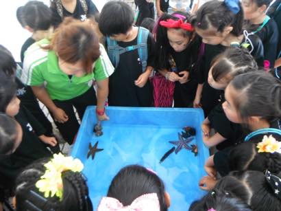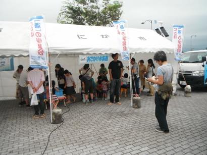 7月25日(土)に「にかほ海の幸まつり」会場にて、「にかほ『海』の学習会」を開催。その中の1つとして、男鹿水族館GAOのおでかけ水族館のブースを開設。ドクターフィッシュや、磯部の生き物などが展示された。実際に触ることができ、たくさんの親子連れや、子どもたちで賑わった。なまこやヒトデに触るのが、初めての子どもも多く、興味津々に水槽を覗き込み、男鹿水族館の職員の説明を聞いていた。