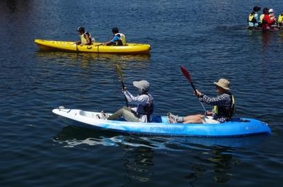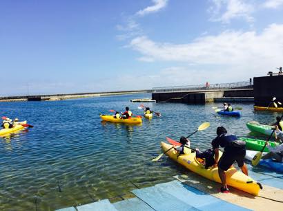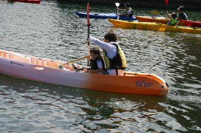 はじめてのカヌーにみなさん最初は悪戦苦闘。パドルがバランスよく漕げずに、思う方向に進まず、消波ブロックや別のカヌーに追突するケースも。スタッフのアドバイスを受けて、しばらくすれば、そこは家族、息のあったパドルさばきで、気持ちよくすいすいと進むカヌーも増え、アンケートでもカヌーが一番人気でした。