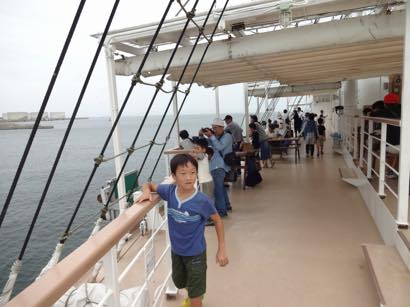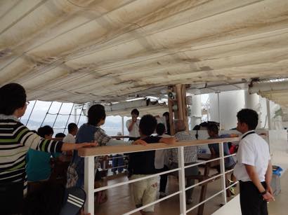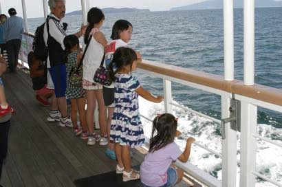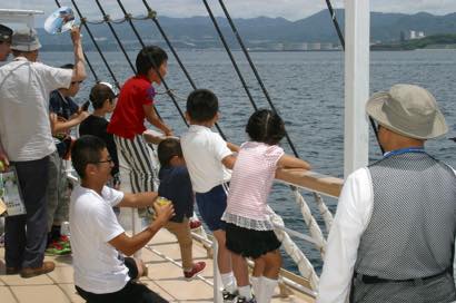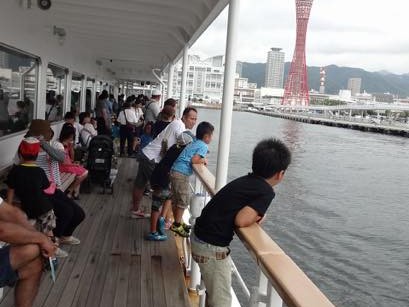 乗船した実行委員長から今回のツアーは日本財団さんの支援をいただき、海の日記念事業として実施することになりました。夏休みの思い出となるよう楽しんでくださいと船内放送を行い、いざ神戸港へ出航。出航してしばらくは、船内を走りまわり、あちらこちらで記念撮影が行われたり、砕ける波を興味深く眺めたり、こどもたちは初めての船旅を楽しんでいました。