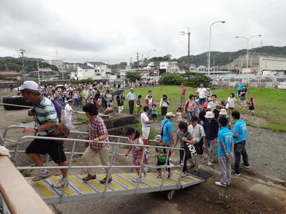 好評をいただいている「うずしお観光船日本丸」による大阪湾ミニクルーズ。毎年、受付開始とともに募集定員を上回り、乗船を楽しみに来場いただいた子どもたちに悲しい思いをさせていましたが、今年は運航回数を2回に増やし、小学生以下を無料として実施。事前のラジオでのPR効果もあったのか、町外を含めて814名(内小学生以下318人)の方に乗船をいただきました。船に乗るのが初めての子どもたちも多く、手すりを乗り越えんばかりの勢いで航跡の波を興味深く見つめていました。