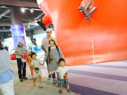 ツアーには海・船・港の役割をこどもたちにもわかりやすく展示する海洋博物館、カワサキワールドの入場券が付いています。カワサキワールドには、船の模型や建造方法、進水式の様子が映像で紹介されるコーナーのほか、水上バイクのゲームもあり、こどもたちも大喜びで海の役割を勉強?していました。また、偶然にも自分たちが乗船してきた日本丸のモデルとなった練習帆船日本丸が反対の岸壁に停泊しており、「あのかっこいい船はなんの船?」と保護者の方に興味深く質問していました。