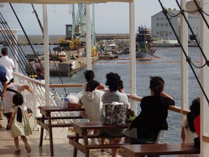 みなさんきっちりと集合時間前に戻ってこられて、予定通り神戸港を出航。日本丸は、少し寄り道をして川崎重工神戸工場のドックを海上から見学しました。めったに見られないドックに、何をするところとこどもたちも興味津々、運よく潜水艦の修繕も行われており、初めて見る潜水艦にこどもたちは大興奮でした。深日港には昔、川崎重工の造船所があって、潜水艦が造られていたとの説明を受けて、保護者の方も深日港にそんな歴史があるんやと驚いていました。