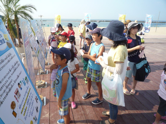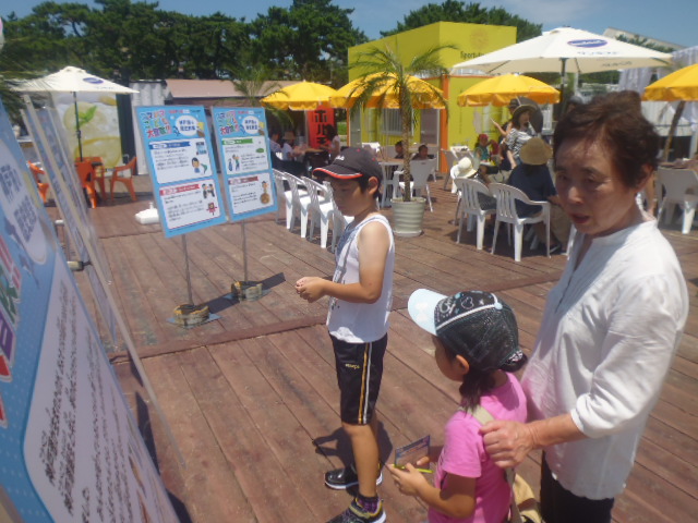 神戸の「日本初」をボードで10点紹介。漁師体験、ライフセービング、工作教室参加者に受付後見てもらいました。